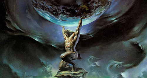 Den greske titanen Atlas deltok, i følge mytologien, i titanenes kamp mot gudene og Zevs sin side. Zevs straffet ham ved å la ham stå på jorda og bære himmelhvelvingen på sine skuldre, og således forhindre at de to gjenopptok deres opprinnelige omfavnelse. En vanlig forvirring er at Atlas bærer jordkloden på sine skuldre og har sitt opphav i den berømte skulpturen Farnese Atlas, en romersk kopi av en hellenistisk statue hvor Atlas holder en solid klode på skuldrene som tvinger ham til å støtte det ene kneet mot bakken.