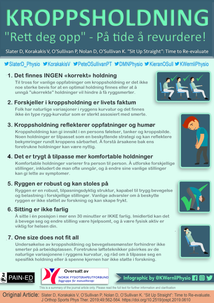 Forskningen de siste 30-40 årene har i overveldende grad avkreftet de endimensjonale og unidireksjonelle sammenhengene mellom kroppsholdning eller sittestilling og muskel-og skjelettsmerter generelt som vi så lett har akseptert gjennom historien.