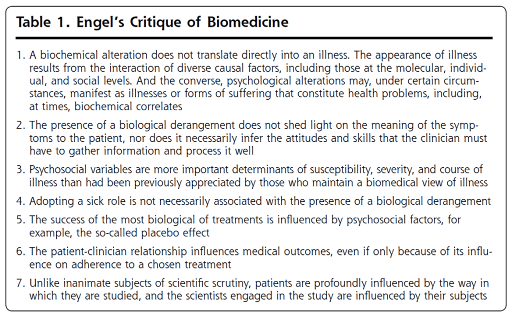 Kritikken var ikke en fundamental bekymring for medisinens kausale sammenhenger, men en kritikk av vår iboende oppfatning om helse og sykdom og konsekvensene av dem. En artikkel fra 2004 med medforfattere fra Rochester universitetssykehus gjør opp status etter 25 år med BPSM og kommer med nyanseringer og peker på modellens utviklingsområder. De har også oppsummert Engel’s kritikk av datidens dominerende paradigme, biomedisinen, i en tabell og da ser jeg ingen grunn til å prøve å formulere det selv: