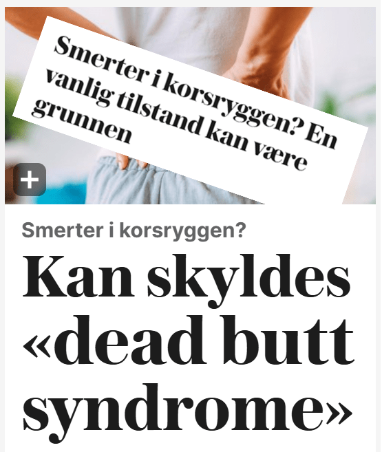 Discalimer: Jeg har ikke lest artikkelen (har ikke tilgang til VG+) men overskriften i seg selv, samt rekkevidden og potensiell påvirkning den kan ha, pluss at det er år 2024, er tilstrekkelig til å si noe om det. Hva enn annet fornuftig og nyansert artikkelen inneholder får bare være. Bare tenk på de titusener med ryggsmerter (eller uten) som leser overskriften, ikke har tilgang til VG+ og googler «Dead Butt Syndrome». 99,99% av det de finner er ukritiske og misledende artikler fra de vanlige helse-kolonistene med gode og/eller click-intensjoner. Søk på «Dead butt syndrome» (og andre brukte navn til denne antatte «tilstanden») i verdens største databaser for forskning gir NULL (!) treff. Det betyr at det IKKE er et anerkjent, akademisk eller vitenskapelig begrep. Søk på Google derimot gir 3’370’000 treff (flest fra USA). Ta dette som et dundrende bevis på overmedikaliseringen og spredning av misinformasjon i samfunnet.